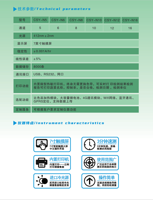 深芬儀器生產(chǎn)的新一代智能型農(nóng)藥殘留快速檢測儀是根據(jù)農(nóng)業(yè)標準方法(NY/T 448-2001)和國標(GB/T5009.199-2003)中的酶抑制率法,嚴格遵循《GB/T5009.199-2003蔬菜中有機磷和氨基甲酸酯類農(nóng)藥殘留快速檢測方法標準》中的規(guī)定對蔬菜、啤酒等各種食品及原料中有機磷和氨基甲酸酯類農(nóng)藥殘留的快速檢測。